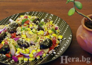 След това го сварете в тенджера под налягане за 40-45 мин. През това време нарежете на ивици печените пиперки, лукът на полукръгчета, а пресните подправки на ситно. Орехите счукайте на дребно. Когато боба се свари, отцедете го и прибавете нарязаните продукти, както и сладката царевица. Овкусете с ябълковия оцет, олиото и солта. По желание можете да допълните рецептата с няколко лъжици доматено пюре или лютеница – комбинацията със зрелия фасул е много сполучлива. След като сервирате салатата в чинии, поръсете я и с натрошените орехи.
