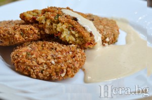 От сместа оформяме кюфтенца с дебелина поне едни пръст. Аз имах няколко пълнозърнести сухара, който натроших и овалях кюфтенцата в тях, но може да се замести и с галета. Нареждат се в тавичка покрита с хартия за печене. Печем на 200 градуса около 40-50 минути.