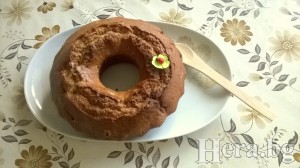 три яйца, шепа орехи, около три шепи стафиди, едно пакетче ванилия и по половин чаена лъжичка от содата, канелата и бакпулвера. Накрая прибавям и