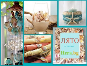 На морските черупки отиват цветове като морско синьо, лазурно синьо и тюркоазено, землисто кафяво, бежово и цвят капучино, естествени материи – коноп и лен, канава и материали като дърво, камък. Експериментирайте смело – колкото по-натурален и дори грубоват е видът на готовата декорация, толкова по-ефектна е тя.