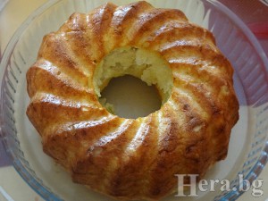 В купата слагаме корите и добре объркваме всичко. Получава се гъста смес, която изсипваме в кексовата форма и печем за 30-40 минути на 200 градуса, както обикновената баница.