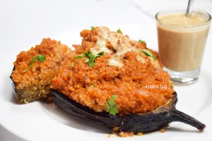 Тази комбинация ще ви изненада много приятно. Лимоново-тахановият сос придава още по-интересен завършек. Самата рецепта не изисква никакви усилия. Докато патладжанът се изпече, киноата и просото са готови, а след това ни трябват само 10 минутки да запечем. Можете да не използвате просо, а само киноа в тази рецепта, която е подходяща за хора, които ограничават глутена.