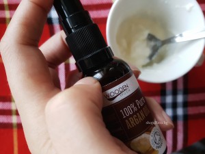 Маската се нанася винаги на добре почистено лице. Преди да я нанеса затварям очи и смело навсякъде впръсквам био розова вода на Alteya Organics. В малка купичка смесвам 2 супени лъжици кисело мляко, био аргановото масло на Wooden Spoon и органичната розовата вода на Alteya Organics. Аргановото масло на Wooden Spoon е с пулверизатор, което поне на мен ми е много удобно (впръсквам от него 7-8 пъти), но ако вашето е с пипетка, капнете по 2-3 капки в киселото мляко. Толкова слагам и от флоралната вода от роза Дамаскена.