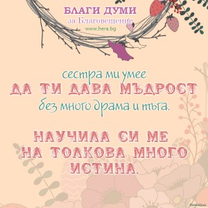 За сметка на това сестра ми умее да ти дава мъдростта без много драма и тъга, вдъхвайки ти оптимизъм и надежда, че доброто носим всички ние в нашите сърца. Сърцата и винаги естествена ще я отриеш там сред най-шумната тълпа да заразява със смеха си, дори и най-заспалия чудак. Смело атакува те и без дори да разбереш ставаш подчинен на нейната магнетична природа. А способността й да раздава доброта те измъква и от най-големите проблеми. Знае как да зарежда с оптимизъм и истината без задръжки ти я заявява. Толкова малко, а пламъкът, който грее в очите й може да стопли и най-студеното сърце.
