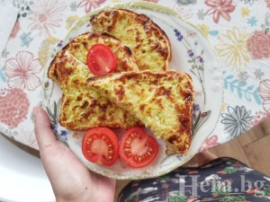 Намазваме филии хляб с нея, отгоре слагаме и по парченце масло за аромат и още вкус. Печем до златисто.