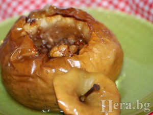 Ябълките измиваме добре и почистваме около семенника с помощта на ножче и лъжичка, с която издълбаваме, като оставяме дъното. Нареждаме ябълките в тавичка.