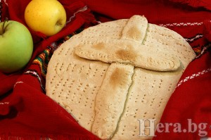 Леко набрашняваме тава - аз я изпекох в тава с диаметър около 23 см. (ако сте повече хора, увеличете двойно съставките и използвайте по-голяма тава). По-голямата част от тестото притискаме към тавата образувайки питка. По-малкото разделяме на две парчета - едно по-малко и едно по-голямо, оформяме ги с ръце на ивици и оформяме украса кръст. Ако желаете можете да направите и друга украса. Печем във фурната на 200 градуса. Гореща я завиваме в кърпа и слагаме на масата непосредствено.